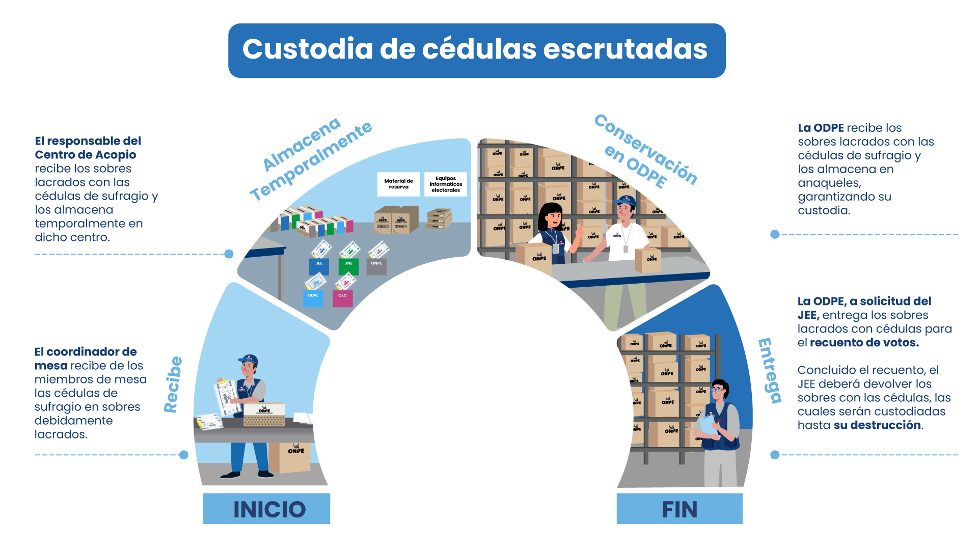 Concluido el escrutinio, las cédulas de sufragio no impugnadas son colocadas en un sobre lacrado y remitidas a la Oficina Nacional de Procesos Electorales (ONPE) para su custodia y conservación, bajo responsabilidad, hasta el día siguiente de la publicación de la proclamación de resultados del proceso electoral respectivo por parte del Jurado Nacional de Elecciones.